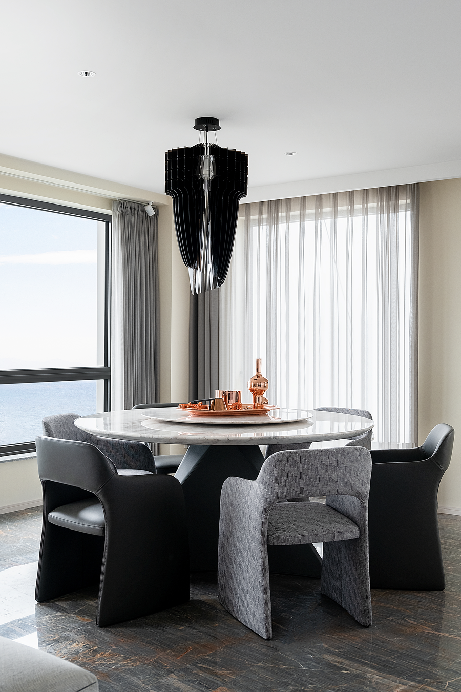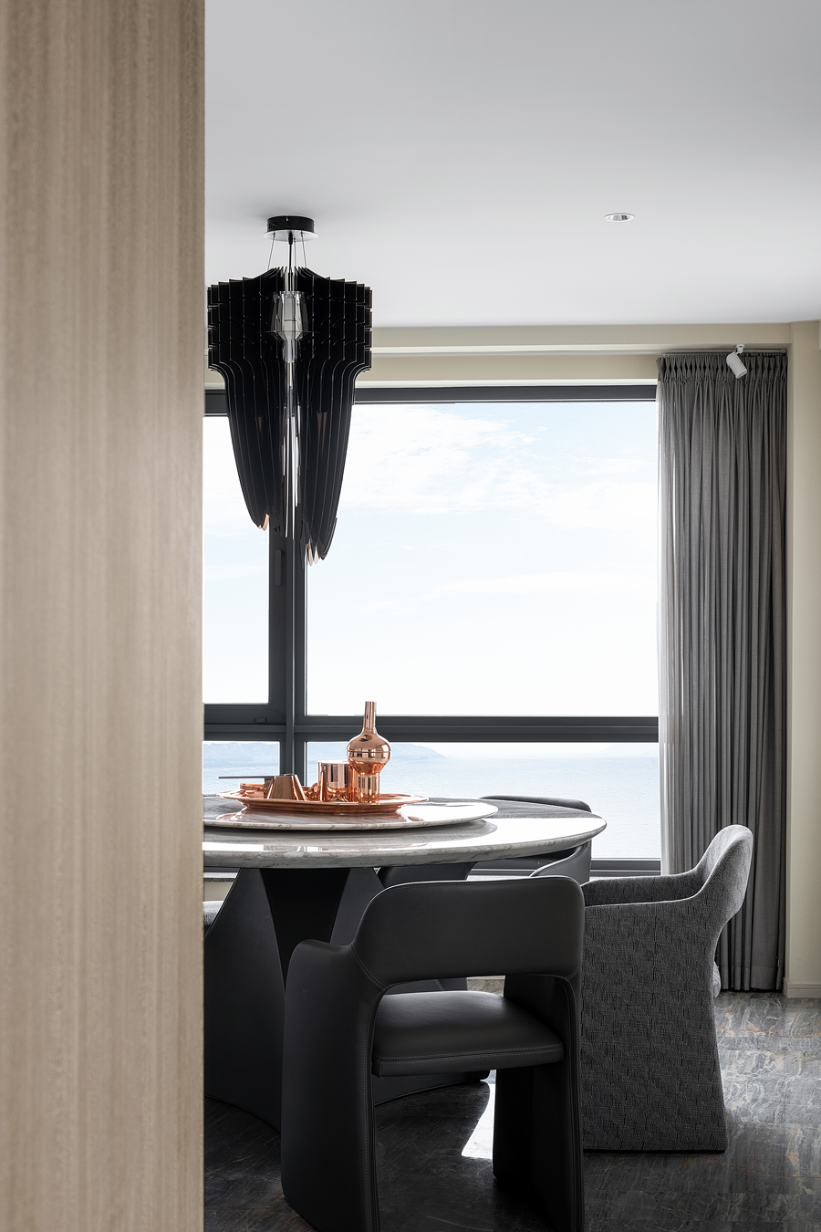 The dining area continues the simple yet elegant design of the living area. The enormous floor-to-ceiling windows create a cozy and chic atmosphere for residents to dine and wine, all while gazing out at the breathtaking ocean views.