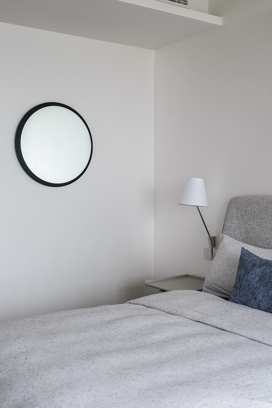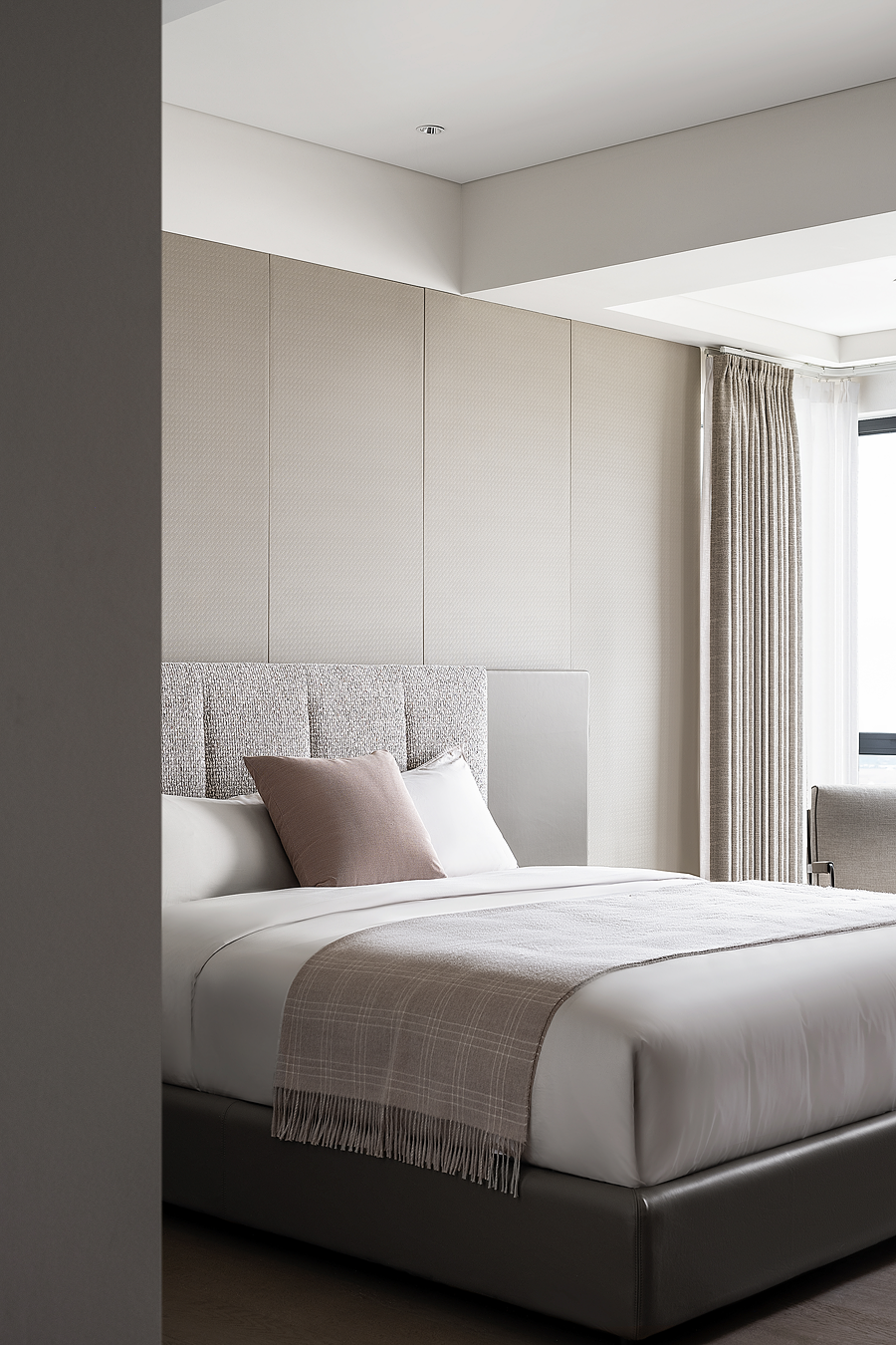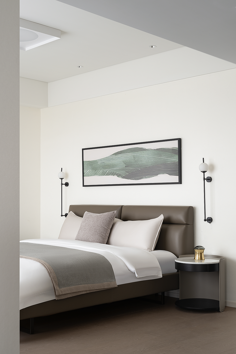 The design of the secondary bedroom emphasizes serenity and comfort, with a stress on the space's elegance and texture. This allows residents to take a quiet break from the hustle and bustle.