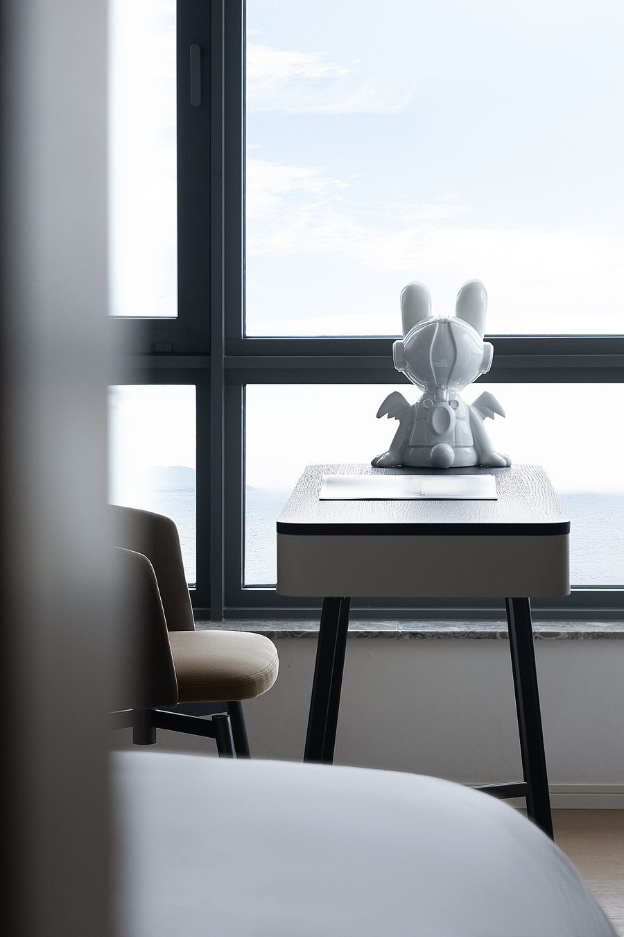 This space serves not only as a place for rest but also includes a functional area for work and study. The thoughtfully designed layout features a simple yet practical office area positioned conveniently next to the window. Complete with the elegant WITTY desk and BALLET chair, it creates a perfect nook for temporary work or study.