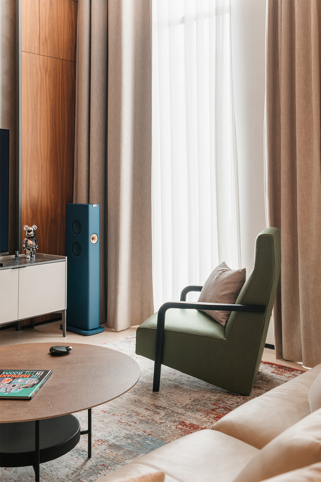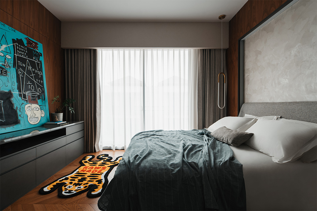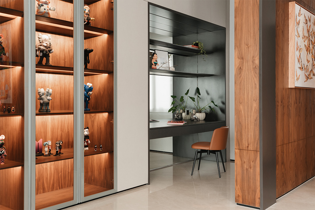With such imaginative design, mild and moderate furniture is needed for balance. CAMERICH furniture is elegantly arranged throughout the space: the soft EASYTIME sofa, the gentle VAST chair, the clean-lined MATRIX cabinet, the comfortable MELODY bed, and the streamlined ECHO chair... Their quiet inclusiveness harmoniously coexists with the traditional South Asian wood elements, trendy dolls, and paintings of varied styles, forming a magical yet stable fusion.