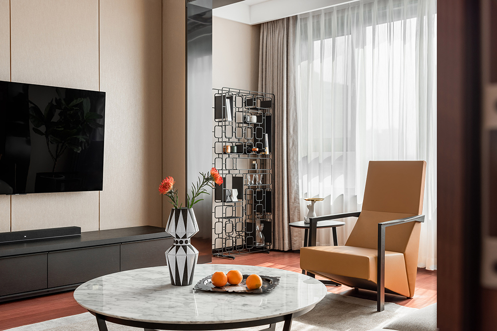 恬静怡然的空间,最能让躁动的心沉静下来。书房的黑白书柜与橙色座椅、线条与块面,既独立又相容,相互统一于整体的空间结构,散发出空阔淡泊的风度。