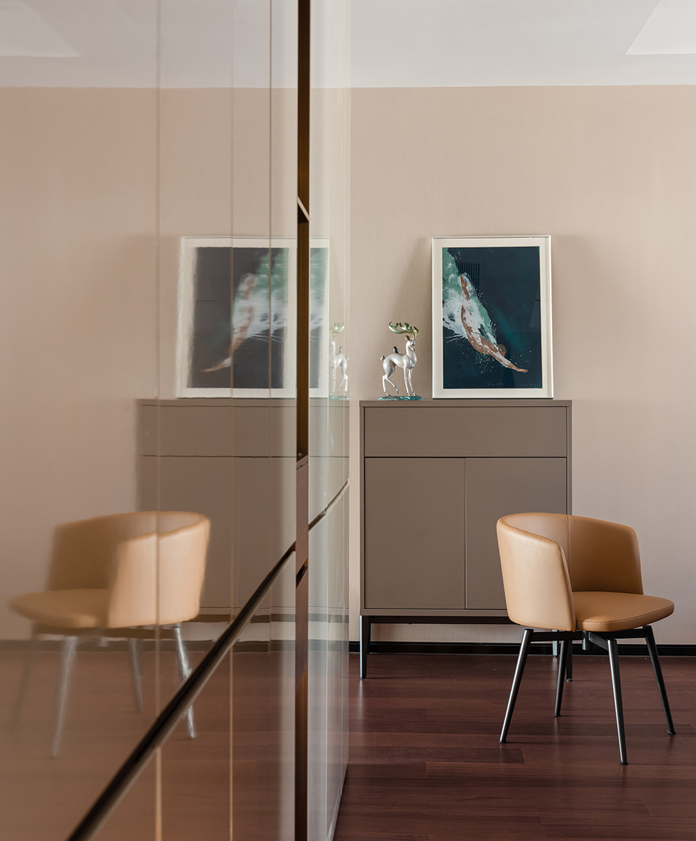 独立式餐厅能够很好地区隔出不同的空间,达到结构化设计的效果。器具别出心裁的设计为空间增添了浓厚的艺术气息,与大理石肌理的桌面形成了默契统一。在吊灯的照射下,倒映出物体之间的窃窃私语。