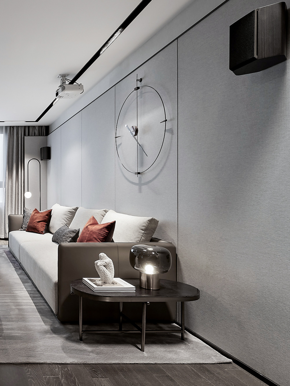 多功能厅,既能作为私密会客厅,又能作为休闲影音室,避免了单一功能空间的浪费,同时也是现代精神的提炼与表达。
