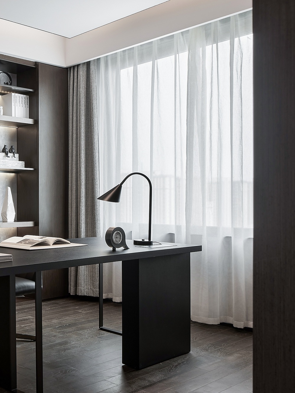 书房是主人最喜欢的地方。日常可以做他最喜欢的事情——阅读与习字,简而不凡、高洁清雅。